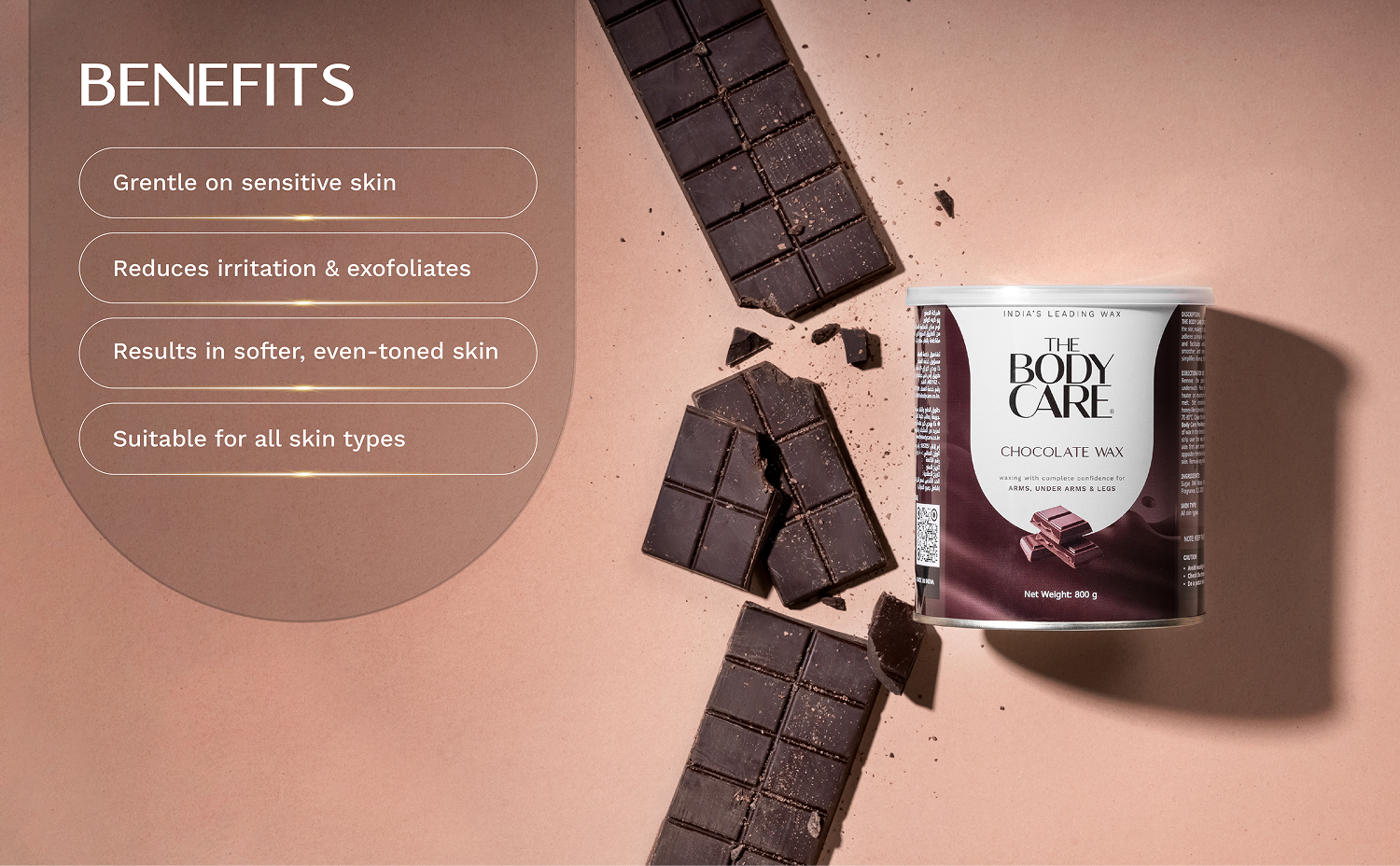 THE BODY CARE CHOCOLATE WAX is gentle on the skin, making it suitable for sensitive skin. It adheres primarily to hair, minimizing irritation, and facilitates exfoliation, leaving the skin smoother and more even. Water solubility simplifies cleanup. Suitable for all skin types.