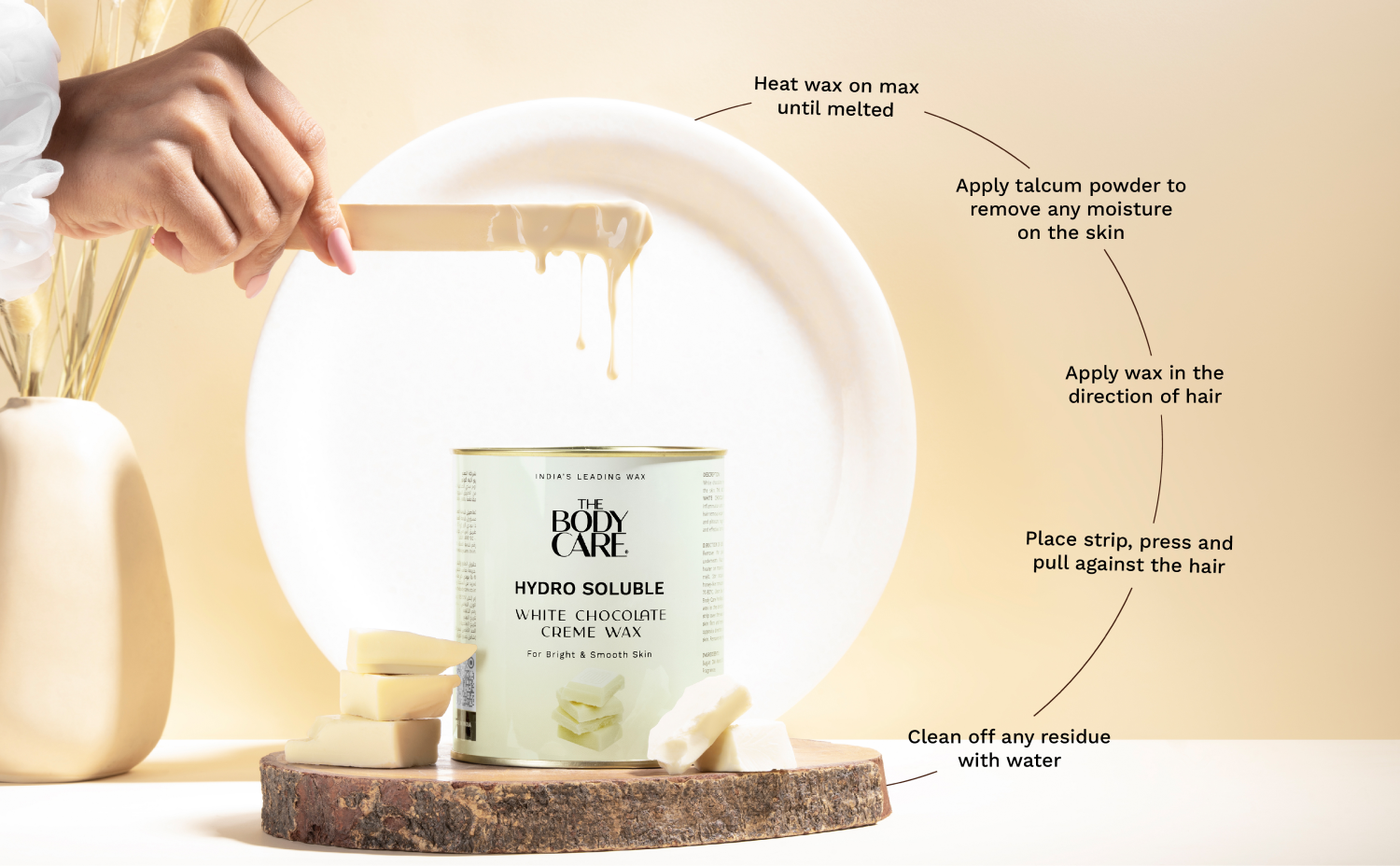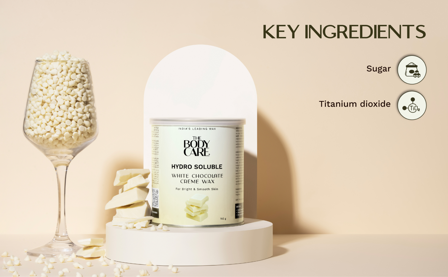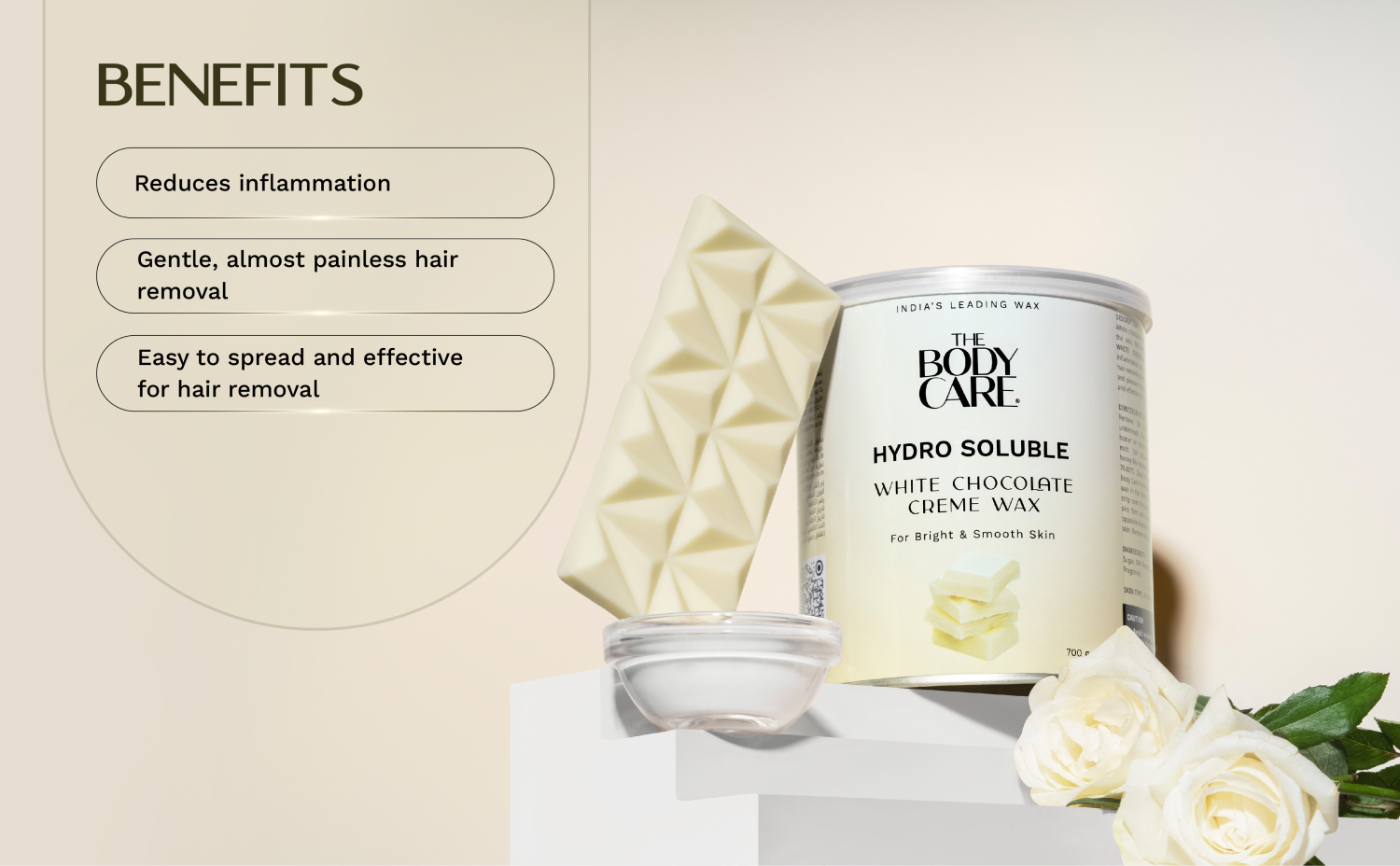 White chocolate deeply nourishes and softens the skin. THE BODY CARE HYDRO SOLUBLE WHITE CHOCOLATE CREME WAX reduces inflammation and provides an almost painless hair removal experience. Its creamy consistency and pleasant fragrance make it easy to spread and effective for hair removal.